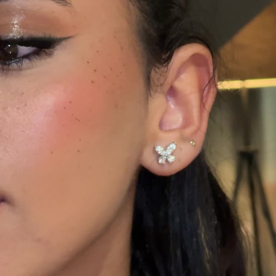 Örhängen formade som en fjäril med vita stenar. En fin och detaljerad design där guld eller silver och vita stenar kombineras för att skapa en vacker fjärilsform.