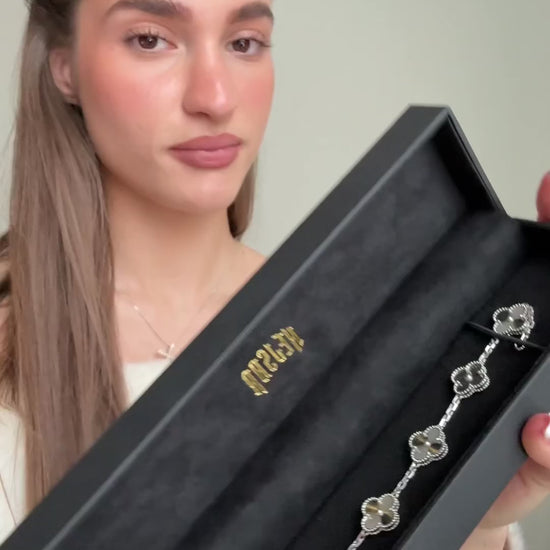 En av våra bästsäljare. Stilrent armband där fyrklöver dekorerar hela kedjan för en unik och harmonisk design. Armbandet är gjort i hållbar metall med äkta 18K guld över och finns i flera färger. En elegant symbol för tur och skönhet som passar perfekt till de flesta tillfällen.