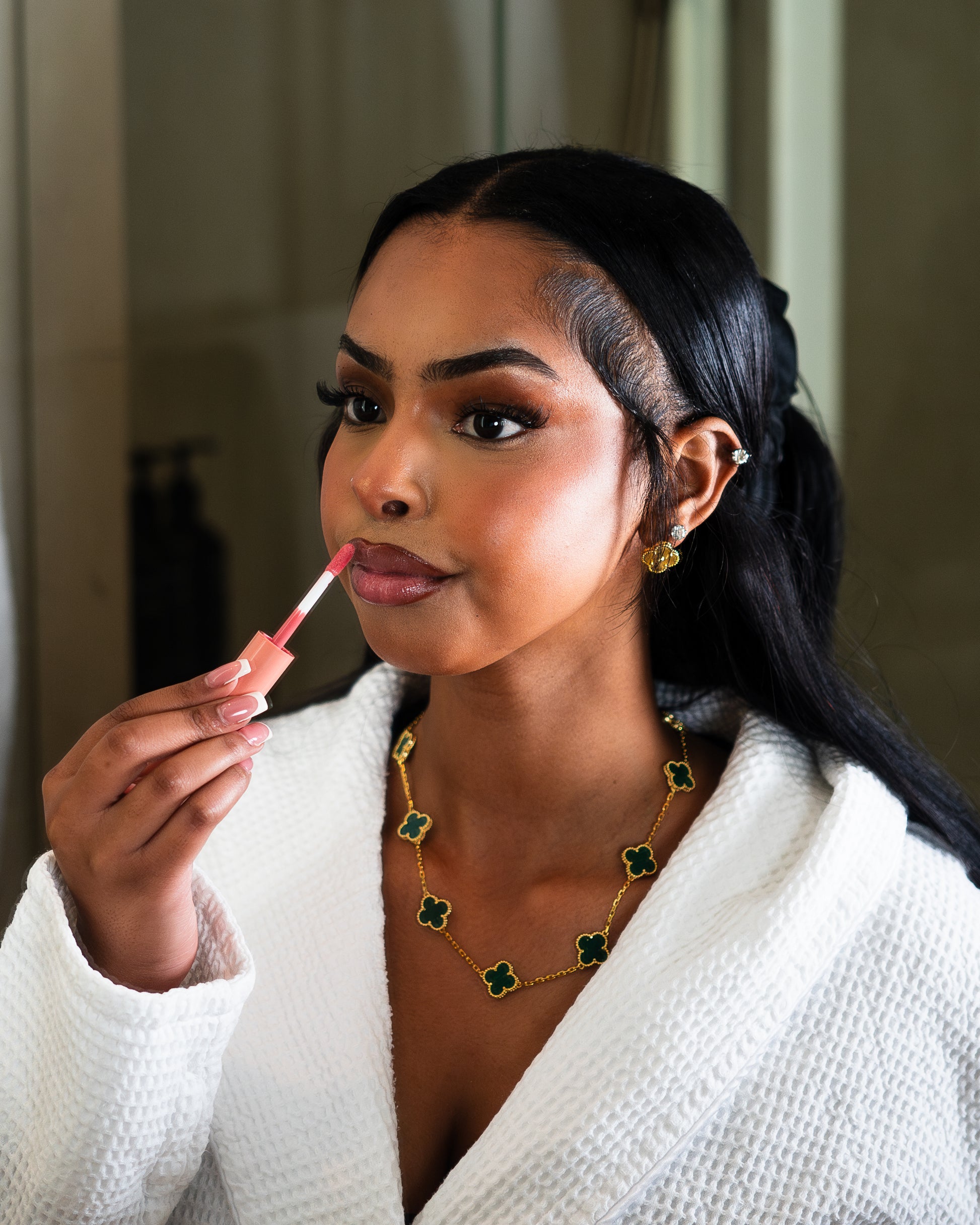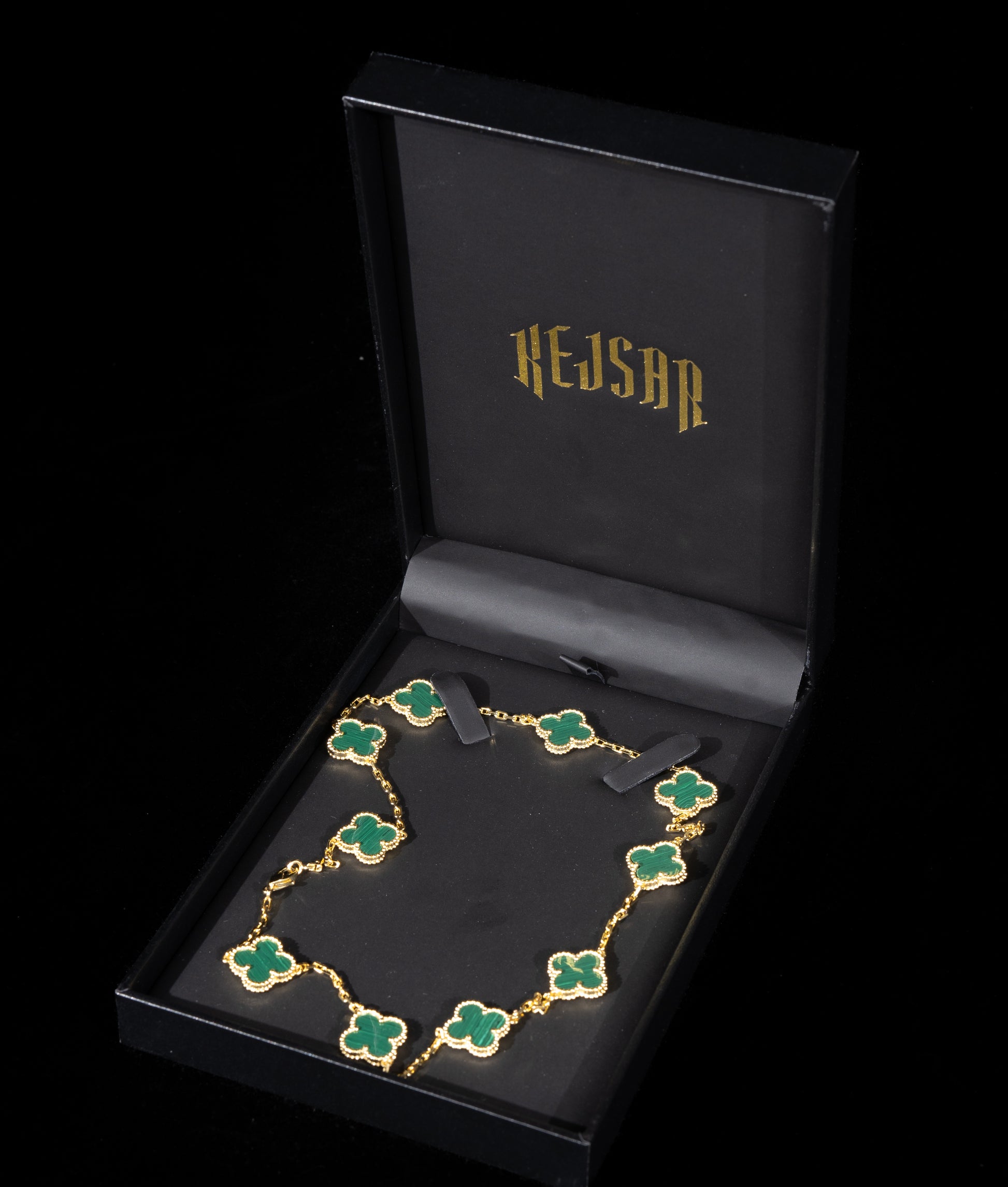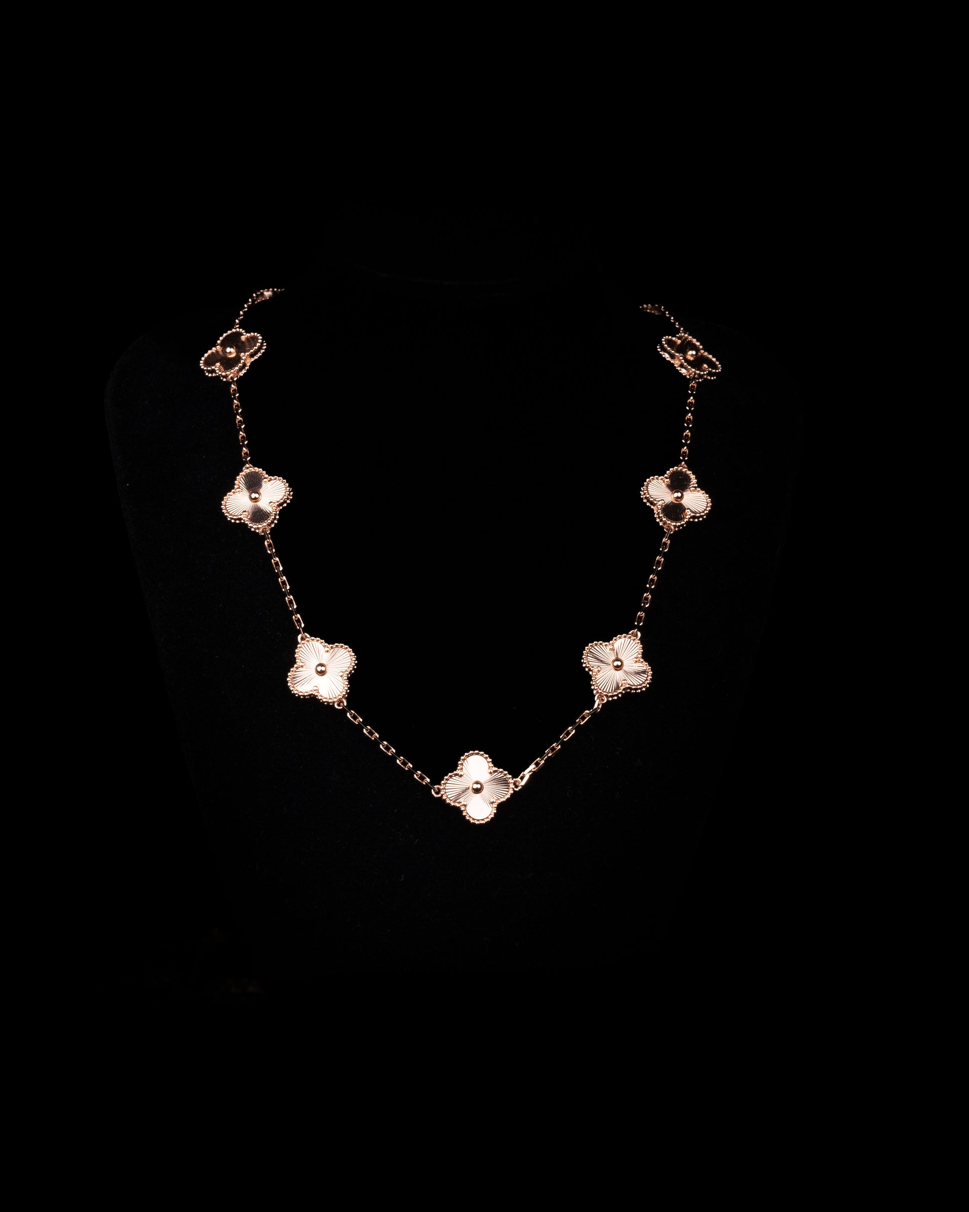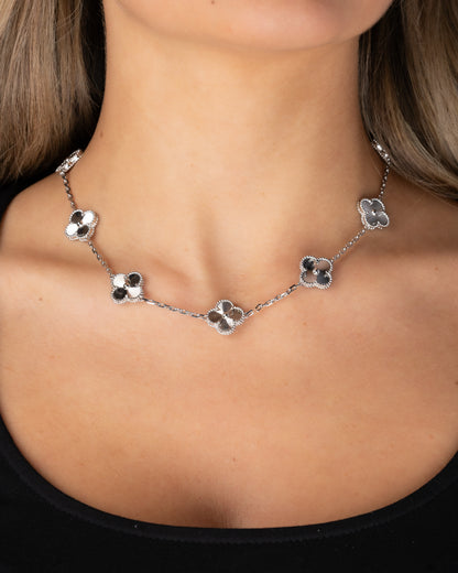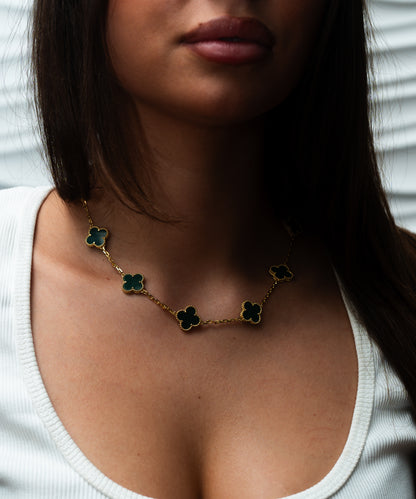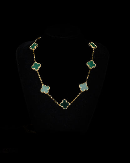 Ett unikt halsband där fyrklöver löper runt hela kedjan, vilket skapar en elegant design. Gjort i hållbart stål med 18K guldplätering och finns att välja i flera färger. Ett vackert smycke som symboliserar tur och stil i perfekt balans. 42-43cm långt.