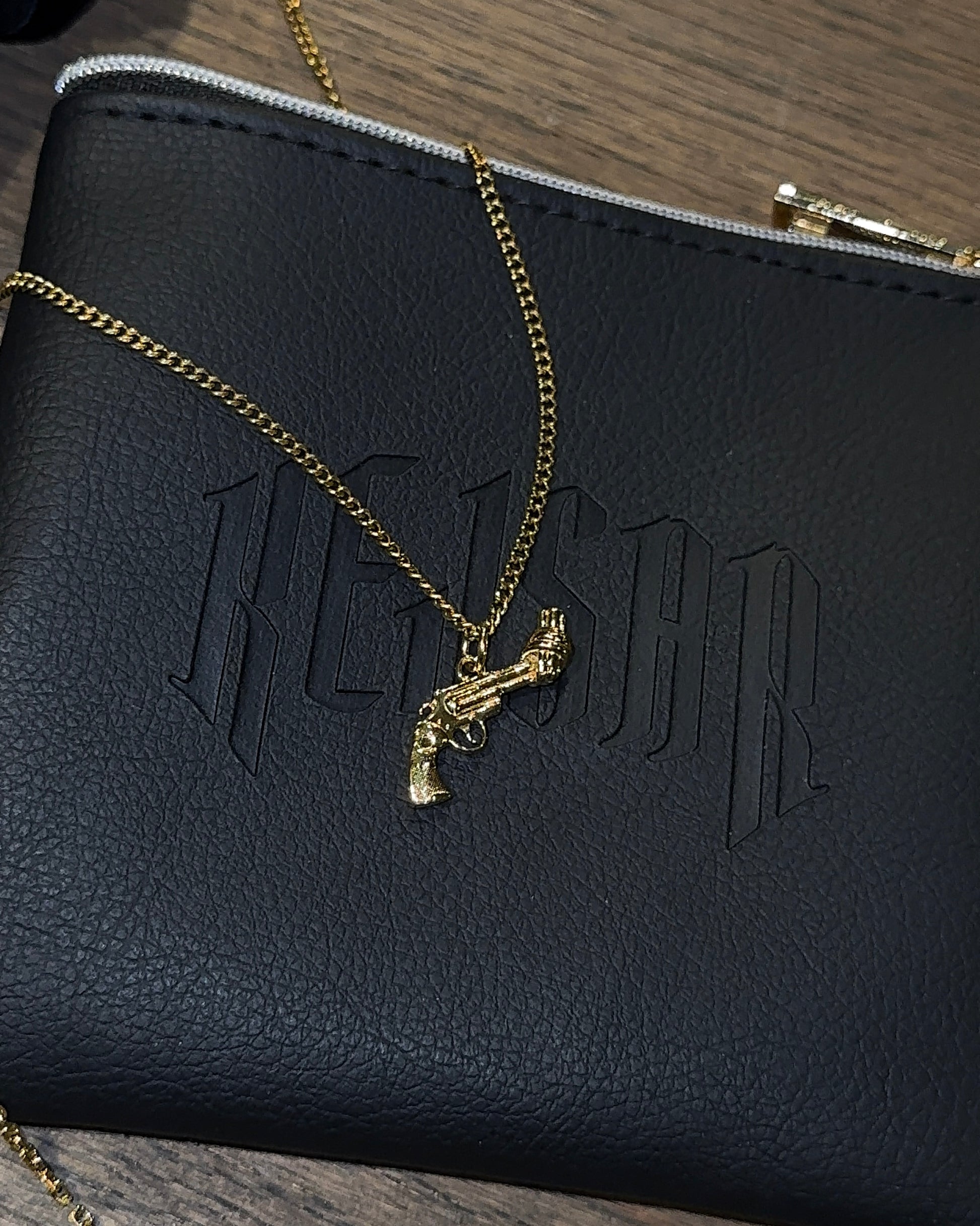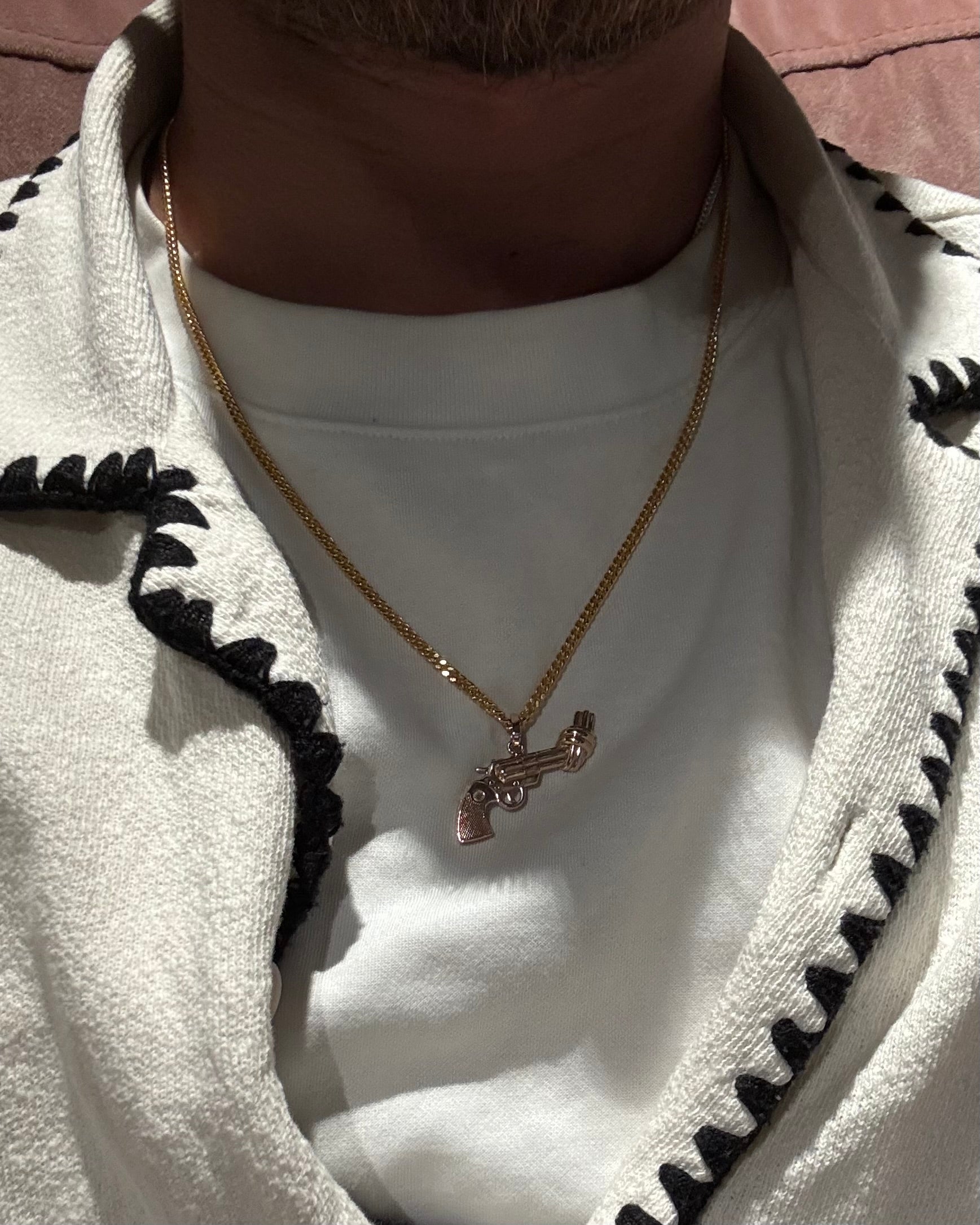 Halsbanden är gjorda i rostfritt stål, kan bäras hela livet och kommer i 2 längder. En dam (40+5cm förlängning) samt Herr (50+5cm). Revolvern är 2.5cm bred och sitter på en 2mm tunn pansarlänk.